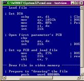 TextView is a size-optimized text file viewer for DOS. The executable was squeezed into 201 bytes without any compression. Still, it provides basic navigation keys and allows smooth per-pixel scrolling in text mode! On Windows this program must be run in full screen. I have not tested it on Windows editions newer than XP.